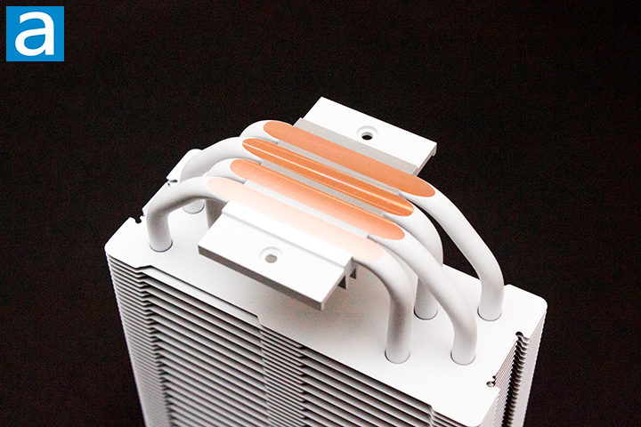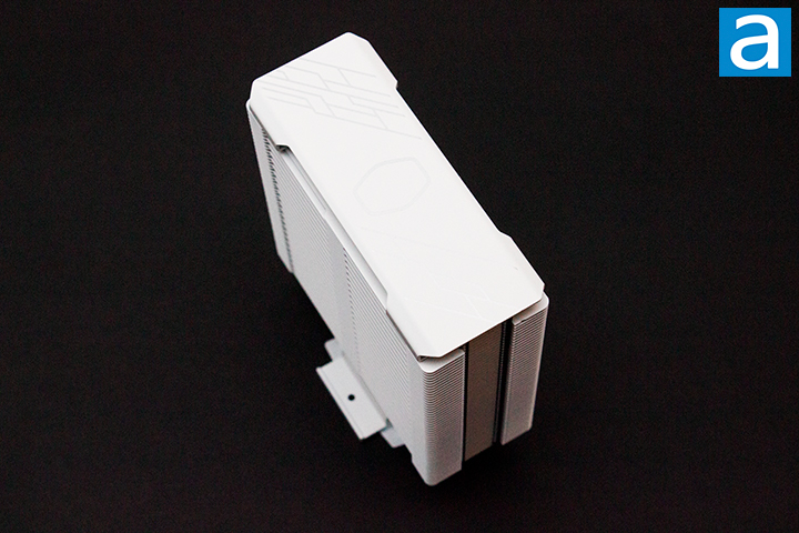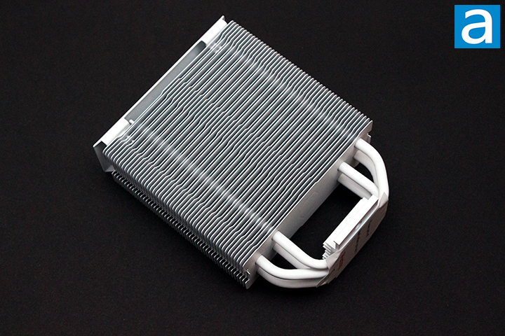For the Cooler Master Hyper 212 Halo White, the orientation of the heatpipes is parallel with the fan mounting surface of the heatsink. The heatpipes are staggered throughout the radiator fins. The layout of the heatpipes of the Hyper 212 Halo White is used to optimally dissipate heat. The fins attach to the heatsink by the included fan clips. The process of removing and reattaching the fan was quite simple.