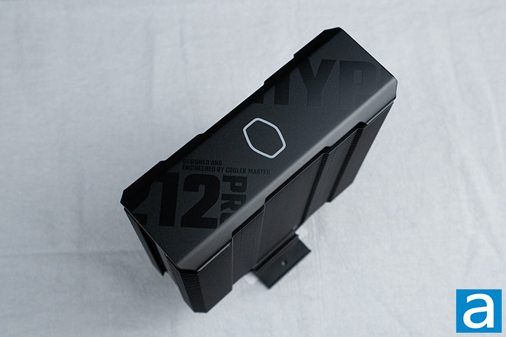 The Cooler Master Hyper 212 Pro we have is in black with ARGB fans, which is the only color option for this version of the Hyper 212. However, there is the Cooler Master Hyper 212 Black, which is nearly identical to the Hyper 212 Pro. The only differences I noticed are the top plate cover design and the use of an ARGB fan. The top plate that protects the heatsink fins has a matte black finish with glossy black text in different font sizes and orientations. The all-black design is then contrasted with the white Cooler Master logo at the center of the plate.