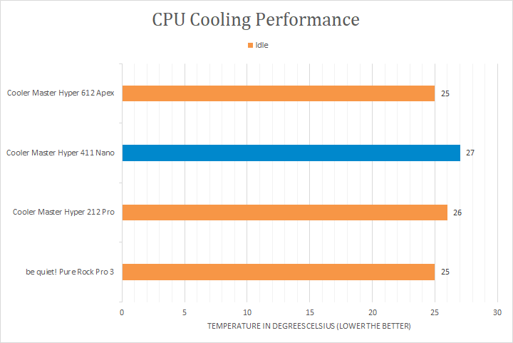 Starting with the idle test, the computer was left idling for a long time before the highest core temperature was taken. In the first graph, the Hyper 411 Nano had the highest temperature at 27 degrees Celsius, which is expected considering it is the smallest cooler of the bunch. The temperature delta between the lowest cooler and the Cooler Master Hyper 411 Nano is only 2 degrees, which is very good, but I would expect this gap to increase during the load test.