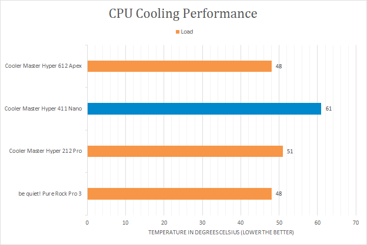 After loading the CPU for over 20 minutes to generate as much heat as possible, the temperature stabilized, and the highest core temperature was 61 degrees Celsius. As expected, the physical limitations of the Cooler Master Hyper 411 Nano were reflected in the higher temperature compared to the other coolers. I would say the 10-degree difference between the Hyper 411 Nano and the Cooler Master Hyper 212 Pro is quite reasonable, given the size difference. Although the delta is a little high compared to the others, I would consider the final temperature of 61 degrees to be quite good.