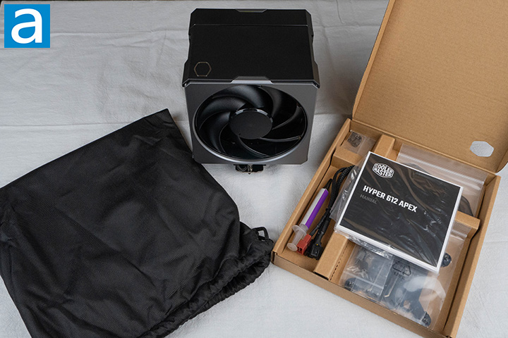 Removing the tool kit from the package, there is a large black bag, which holds the Hyper 612 Apex air cooler. I am not the best at identifying fabric materials, but my guess would be the bag is made with synthetic cotton. With just the toolkit and the cooler, the unboxing experience is quite simple. However, despite the simplicity, the tool kit, combined with the bag holding the cooler, gives a rather premium feel to the experience.