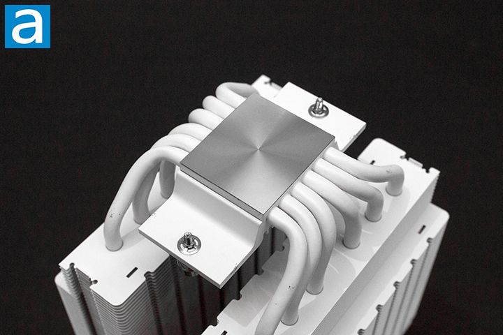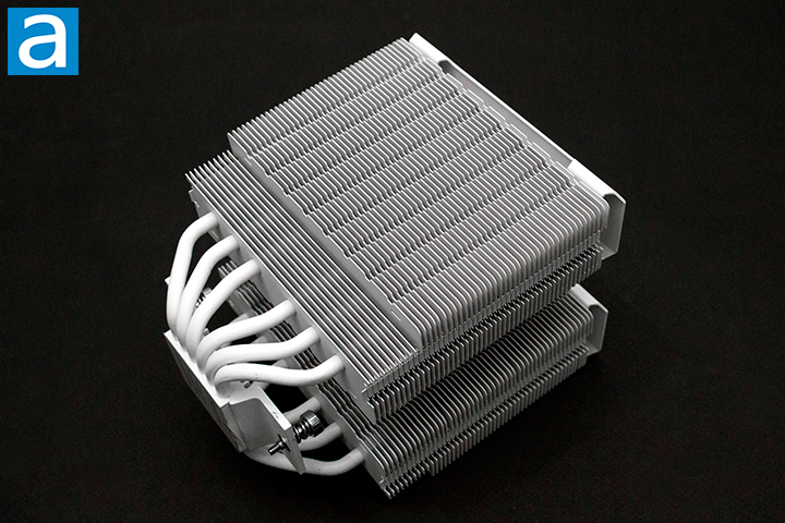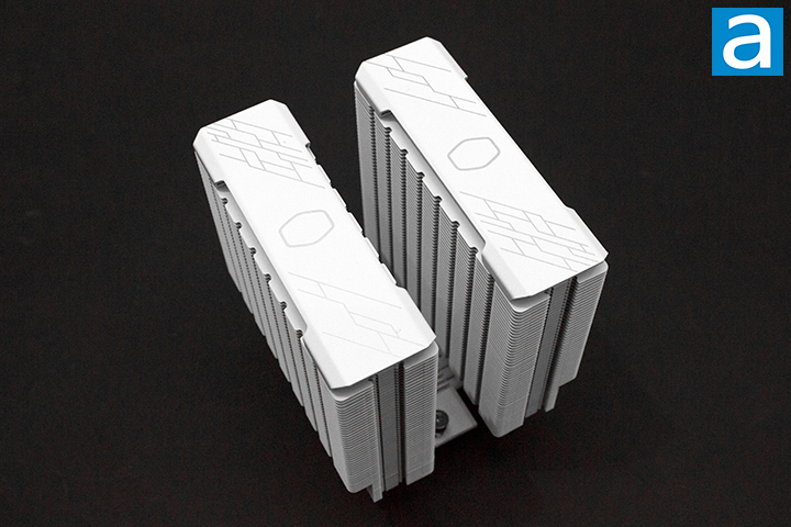 For the Cooler Master Hyper 622 Halo White, the orientation of the heatpipes is parallel with the fan mounting surface of the heatsink. The heatpipes are staggered throughout the radiator fins. The layout of the heatpipes of the Hyper 622 Halo White is used to optimally dissipate heat. The fins attach to the heatsink by the included fan clips. The process of removing and reattaching the fan was quite simple.
