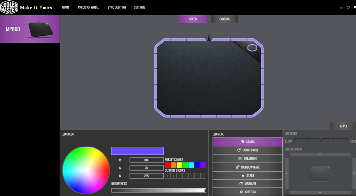 The software is simple and basic. It has one function and that is to change the LED lighting. At the top, one can choose which side you are using to ensure the LEDs are in the right position. Around the MasterAccessory MP860, we have 19 LEDs, which is plenty to brightly and in good color bring something extra to your gaming setup. Along the bottom, we find the color wheel, allowing one to precisely choose the color you want. I know with some RGB products I have had in the past, the software sometimes only allows five or six colors to choose from, but the color wheel really does give the choice of over 16.7 million colors. Each of the LEDs can be programmed individually, ensuring you can create some cool custom colors. Otherwise, Cooler Master provides some basic lighting effects to choose from next to the color wheel. With the moving lighting effects, you can change the direction and how fast they go. Cooler Master has definitely given one control over the RGB features, which is excellent. The software is decent and can sync up with other Cooler Master products.