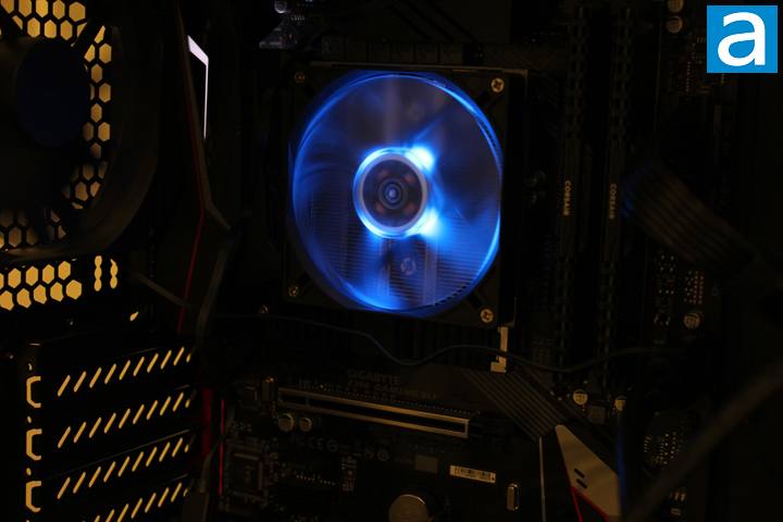 I am the kind of person who really cares about the noise level of my computer. On a scale of 0 to 10, where 0 is totally silent and 10 is a jet taking off, I would rate the the MasterAir G200P at 2.0/10 and 4.0/10 regarding noise emissions at idle and high load, respectively. The 92mm PWM fan was reasonably quiet at lower speeds. However, the fan can be a little bit noisy at higher RPM. It is worth mentioning that the fan can spin as fast as 2600 RPM, which is necessary for a fan of such a small size. If you are not happy with the noise of the fan, at least the RGB lighting looks good here, haha.