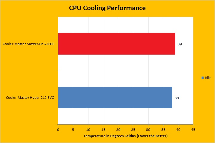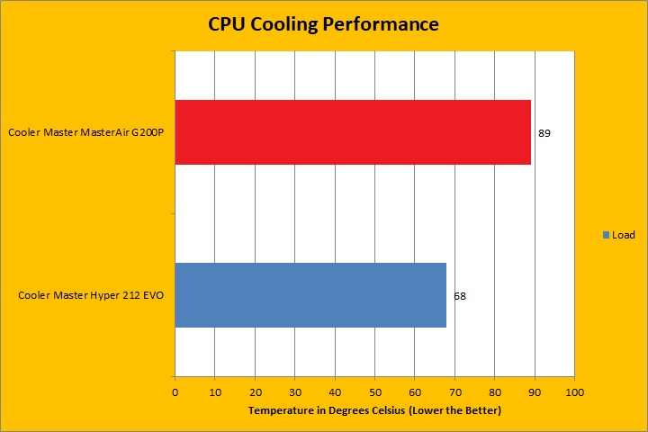 All tests were run in our custom built computer to best reflect real life performance. The computer remained in the same place and room for all tests. The ambient temperature of the room was roughly 22 degrees Celsius. The thermal paste applied to each cooler was stock respective to their manufacturer's to rate its performance. Sufficient time between testing was applied for the paste to settle. The fans on all heatsinks were connected to the same motherboard 4-pin connector. The test computer was turned on and idling for at least one hour for the idling tests. High CPU load results were obtained using the Prime95 in place large FFTs test with eight worker threads for a minimum of fifteen minutes and recorded when the temperature was deemed stable. The Cooler Master MasterAir G200P was tested using the stock fan from factory. The performance was compared with an air cooled CPU cooler from Cooler Master, the Cooler Master Hyper 212 EVO. The purpose of doing such tests was not for a straight performance competition, since they were quite different in terms of design and fan size; it was for a performance perspective. The temperature results for each cooler was measured with CoreTemp, which reports the CPU's integrated digital thermal sensor for maximum accuracy. Each temperature result was calculated by taking the maximum value of the cores inside the CPU.