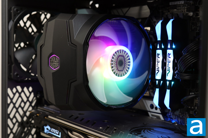However, if we look at the sound analysis section of the Cooler Master MasterAir MA610P ARGB, on a scale of 0 to 10, where 0 is silence and 10 is the definition of loud, I would rate the MA610P ARGB at 3.5/10 during idle and around 5.5/10 under full load for the dual 120mm fan configuration. I have found SickleFlow fans to be a bit louder under full load, and the 120mm fans spin fast to keep the temperatures low. On a day-to-day use, the whole solution is generally acceptable, but when the processor is at full load, the fans are quite audible. Otherwise, I will say that the lights on the MasterAir MA610P ARGB are visually quite loud with a nice blaring set of lights on the fans and on the plastic shroud at the top. Although I am still not a fan of how tall this cooler is, the lights underneath this plastic shroud do look quite nice with several sections of translucent plastic to let the light bleed through.