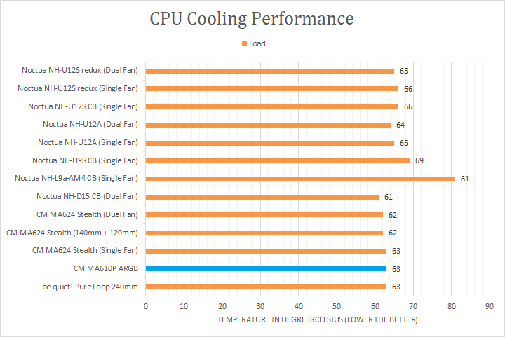 After turning on Prime95 and allowing sufficient time to load the processor on all cores and threads, you can see how each of the coolers performed with the peak temperatures. Once again, the Cooler Master MasterAir MA610P ARGB performed well with a load temperature of 63c. This was the same as the AIO cooler we have here, while being two degrees warmer than the excellent NH-D15 chromax.black. Compared to the smaller 120mm based air coolers like the NH-U12A, this is one to two degrees cooler, which is still an improvement. We were able to observe the same boost frequencies throughout the test across our tower coolers with 3.8GHz across all cores. Overall, these results show the MasterAir MA610P ARGB performs exactly as you might expect, which is a positive mark.