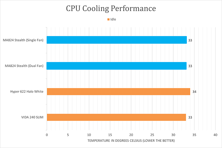 In the idle test, the Cooler Master MasterAir MA824 Stealth in both configurations came in on par with the SilverStone VIDA 240 SLIM at 33 degrees Celsius. The Cooler Master Hyper 622 Halo White followed behind, being only 1 degree behind. The performance was what was expected given the size of the cooler. This performance was more than satisfactory, but the idle test aside, let us look at the test that really matters.
