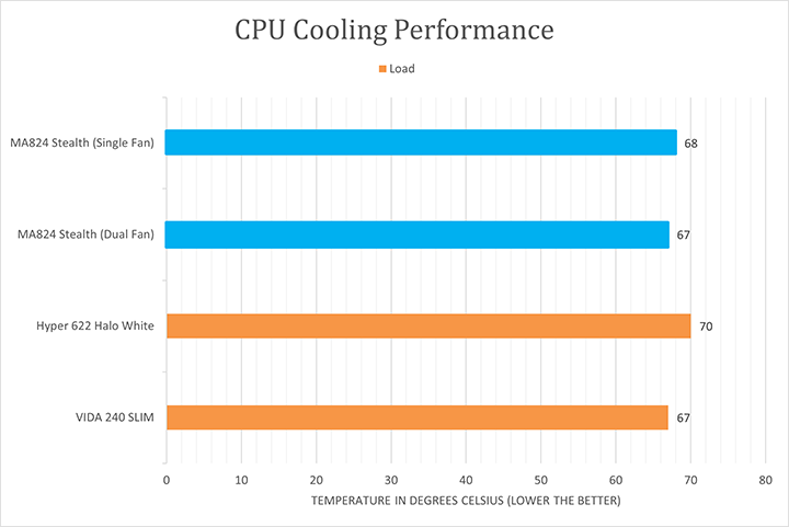 After enough time of stressing the CPU, I was able to push all three coolers to their limits to see what they could do. After running Prime95 for about 45 minutes, the Cooler Master MasterAir MA824 Stealth was able to stabilize the CPU's temperature at 67 degrees Celsius with dual fans and 68c with a single fan. The difference between the MasterAir MA824 Stealth and the Hyper 622 Halo White in dual fan configurations was only 3 degrees Celsius lower using both fans and 2c lower while in a single fan configuration. The MasterAir MA824 Stealth was able to match the likes of the SilverStone VIDA 240 SLIM when using a dual fan configuration. When using a single fan, the performance was raised by only 1 degree. The MasterAir MA824 Stealth’s performance was admirable in keeping the CPU cool under heavy workloads. Of course, the gap will widen with hotter CPUs. The performance observed was expected relative to the other tested coolers.