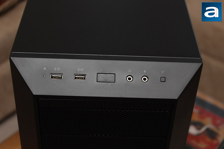 The first place we go to is the front input and outputs on the Cooler Master MasterBox 5. From left to right we have an HDD activity light, two USB 3.0 ports, power button, two 3.5mm audio jacks, and a reset button. This is pretty standard from most computers, although the location is a bit different. Rather than being on the front or the top of the case, it is on a slanted part of the case that sticks out from the front and the top. Either way, this is probably the compromise between the two locations, accommodating for computers being placed either on or above the floor. Otherwise, at the top of the case, there is another ventilated area near the back to allow users to add extra cooling hardware, but I will see more about this later.