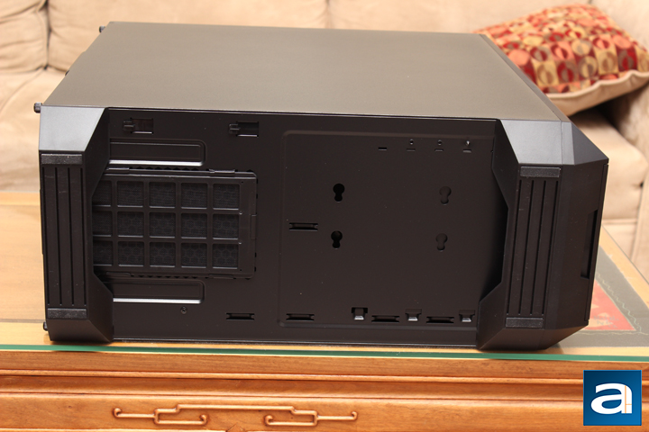 Moving to the back, the Cooler Master MasterBox 5 shows a pretty standard layout. At the bottom we have the power supply area. Above this are seven expansion slots, standard for a mid-tower ATX case. You might notice the bottom expansion slot cover looks a bit different than the others. This is what Cooler Master has dubbed their StormGuard system, and it is used to tie peripherals into place. While it is not a permanent solution, it does provide some resistance to prevent people from taking your hardware. Above the expansion bays is the motherboard cutout area. Finally, next to this is a ventilation for the rear exhaust of the MasterBox 5. A single 120mm fan can be placed here, and Cooler Master has done so with a generic 3-pin Cooler Master fan. It has a model number of DF120251-SELN, with a rated maximum rotational speed of approximately 1200RPM.