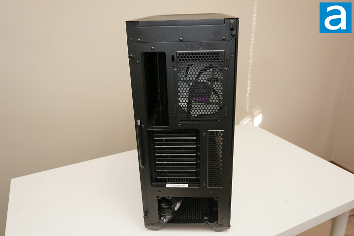 The back of the Cooler Master MasterBox 540, like the rest of the case, is simple and clean. There are four major sections at the back; namely, the power supply mounting area, motherboard I/O backplate, rear exhaust, and expansion card slots. According to the shape of the power supply mounting hole, the power supply is horizontally mounted at the bottom section of the chassis. Since the power supply has already taken this bottom position, the motherboard can only be located above it, meaning the I/O backplate opening is at the top. There are seven conventional expansion slots available on the MasterBox 540, which is standard for an ATX mid-tower. There are no vertical expansion card slots to show off your video card. As for the rear exhaust, as you can see from the photo above, there is a Cooler Master SickleFlow 120 ARGB 120mm fan included from the manufacturer.