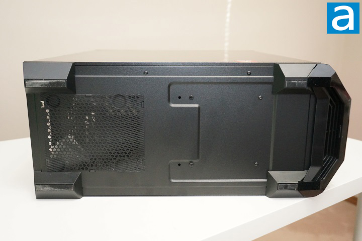 In the above picture, you can clearly see the top dust filter is of good quality. It is magnetically attached to the chassis, but the gap between the filter and the chassis is hardly noticeable. Another thing worth mentioning is the connection between the tempered glass side panel and front panel. The connection is pretty smooth. The gap is really small and there are no sharp edges between the two of them. To remove the side panels, users do not need to use any tools. Two captive thumbscrews can be easily unscrewed to pop off the steel side panel. As for the tempered glass one, it does not need to be pulled backward to detach, since there is no rail mechanism. A pop out of the ball-and-socket joints is all you need to get the tempered glass panel off the chassis. An optional thumbscrew can be used to secure the tempered glass side panel if you want to.