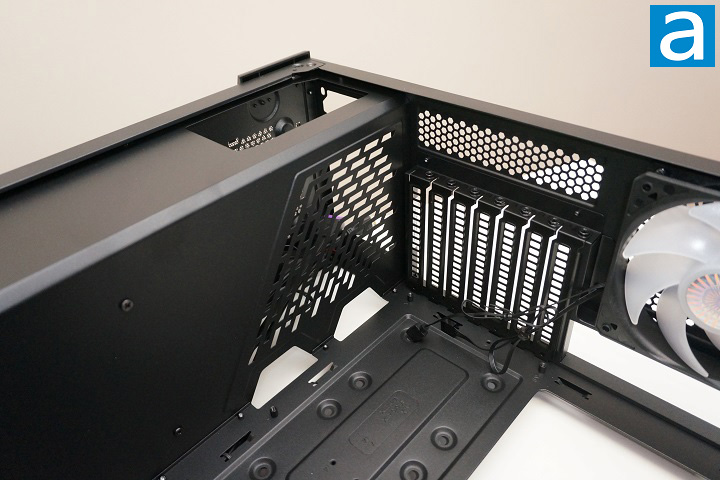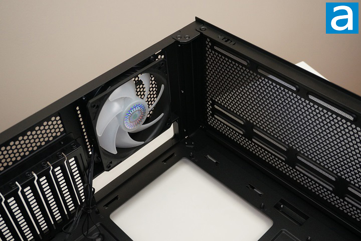 From the above photo, you can see there is a Cooler Master SickleFlow 120 ARGB 120mm fan from the factory on the case’s rear exhaust opening. This is a 4-pin PWM ARGB fan specified that can run as low as 650 RPM to up to 1800 RPM. If the user wants to use an all-in-one water cooling system, it requires an extra step to install the radiator directly onto the chassis, which means removing the preinstalled fan. If the all-in-one water cooling system requires the radiator to be mounted on the top panel, the removable top panel can be very handy. The user can remove the top panel before installing any cooling equipment on it. The benefit is to have unlimited working space to mount your components.