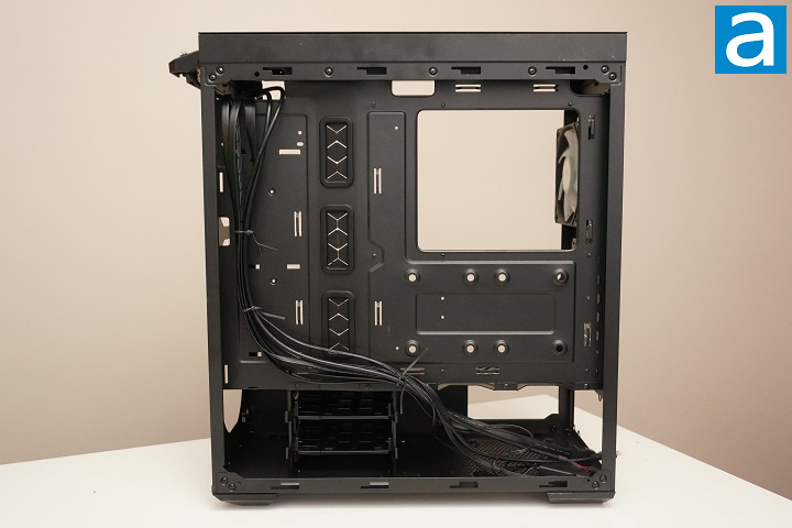 Upon removing the right side panel, you will see the other side of the lower chamber and the motherboard tray. Two 3.5" HDD trays are located to the left side of the power supply area for easy installing and removing of the hard drives. For the 2.5" drives, you can have maximum four of them, with two mounted on the 3.5" HDD trays, and the other two mounted on the back of the motherboard tray. Regarding cable management, between the motherboard tray and the right side panel, the room for cable routing is about 20mm, which is not a lot but enough to use. Furthermore, the I/O connector cables are pretty much the same as what you could find from any other cases. According to the above picture, there is no Velcro strap provided from factory, which means we need to use zip ties for cable management. By the way, there are three long openings with rubber grommets to route cables. There is no need to worry about the safety of the cables or your fingers during installation thanks to these grommets.
