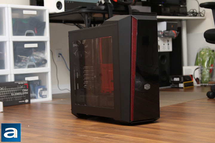 Upon initial review, it becomes apparent Cooler Master has sought to differentiate the MasterBox 5t from other MasterBox cases. Externally, the case has a very similar look to its predecessor, the Cooler Master MasterBox 5. However, it has some distinct differences that set it apart. The symmetrical case boasts clean lines, includes I/O ports, and features a primarily steel body in a black matte finish with a splash of red color on both the front panel and top dust cover. This being said, the red color scheme does somewhat limit the inclusion of lighting in different LED colors, should that be of interest. The front of the case is a tinted plastic window where the fans, especially if they are equipped with LEDs, can be highlighted. The Cooler Master logo is prominently located on the face of the case, and a carrying handle can be found behind the I/O ports, which effectively addresses portability. Overall, the aesthetics of the case are striking in my opinion, and the quality has been factor as I believe the MasterBox 5t is both well-constructed and built to last.