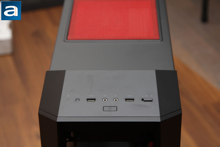 Cooler Master has located the input and outputs on the top of the Cooler Master MasterBox 5t. Moving from left to right, there is an HDD activity light, reset button, USB 3.0 port, 3.5 mm headphone jack, 3.5 mm microphone jack, another USB 3.0 port, and finally a fan control button. The power button is located directly in front of and between the two 3.5 mm jacks. The placement of the input and outputs by Cooler Master is ideal for a case being placed on the floor. However, it may not accommodate as well those users who prefer locating a case on top of a desk. Lastly, at the very back of the case is a ventilated panel on top, which is meant to help address cooling.