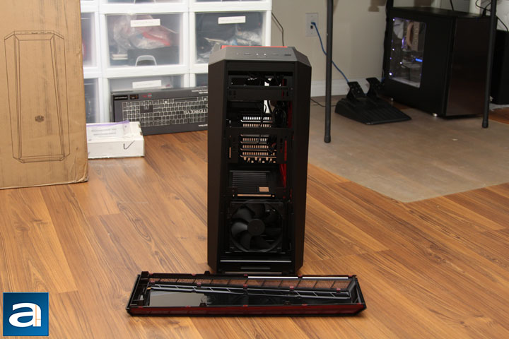 The panel on the front of the case is something that will catch any consumer’s eye, and for a good reason. The front of the case is composed of dark tinted plastic that is detachable for fan installation and maintenance. This design is extremely efficient as removal and reinstallation of the front panel can be achieved in mere seconds. The red accents on the dust filters give it an aesthetic edge that has not been seen on previous Cooler Master cases, and is a stylistic change I can appreciate. The plastic panel, however, is somewhat problematic in that it attracts dust quite easily, and would need to be wiped fairly regularly to remove build-up due to static, prints, or pet fur. Aesthetically, the tinted plastic detracts slightly from any lighting a user might wish to install behind the panel, because the dark hue tends to mute the brilliance of an LED light source. In reality, this is a small issue based on personal preference, and does not detract from the case in any critical measure. Removing the front panel reveals sufficient space to accommodate up to three 120mm fans, two 140 mm fans, or a front mounted radiator up to 360mm. It should be noted front facing fans behind the solid panel will have to work harder in order to drive the same amount of airflow that would be more readily available in a mesh front panel. However, this case boasts plenty of space overall those interesting in considering a variety of builds.