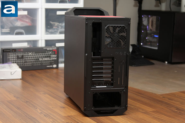 Examining the back of the case, the layout of the Cooler Master MasterBox 5t is fairly typical in terms of layout. The power supply is located at the bottom of the case with all seven of the expansion slots placed neatly above it and the motherboard cut out just above the seven expansion slots. In fact, for those familiar with Cooler Master’s MasterBox 5, it should be noted the back panel of the Cooler Master MasterBox 5t is pretty much identical in design. There is a slot for a single 120 mm fan, which comes pre-installed, as well as the Cooler Master’s patented bottom expansion slot cover, known as their StormGuard system, used to secure peripherals. Finally, there is ventilation for rear exhaust. The fan controller switch is included in the front as aforementioned.