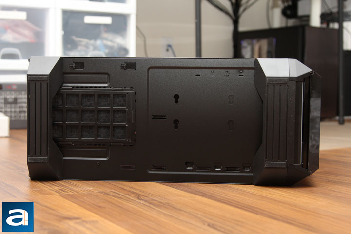 Checking out the bottom of the case, Cooler Master has opted for incorporate a two-leg system, which slant out from the bottom of the case in both the back and front. Rubber pads have been attached to protect the surface of both the case and the resting place of the computer, and are effective in reducing any vibration emanating from the case itself. The case also features a removable dust filter to prevent dust from entering the power supply, which is simple to remove and clean. The final notable entry for the bottom of the case are the extra mounting holes, which will be discussed later on in this review.