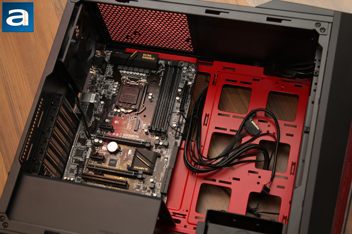 The best part of working with a case is the point where the installation finally occurs. So, to begin my build, I installed the motherboard, in this instance, the Gigabyte GA-Z170 HD3P. However, at the time pictures were taken, no RAM had been installed. The screws fit perfectly and were easy to attach, and when tested, fit with multiple motherboards. As it will be seen in a later picture, a CPU cooler is also installed in this build, the Cooler Master Hyper 212 EVO, which is a bit of a smaller cooler, especially given the fact this case can hold coolers up to 167mm in height.