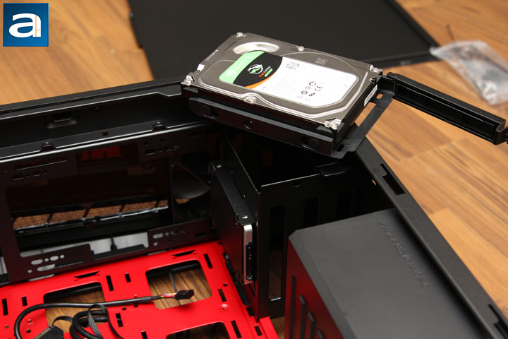 Next, I installed my hard drive into the case, which, with the new easy drawer system, made this part a breeze. As seen in the picture, the 2.5” SSD is already installed in the special mount on top of the dual drive bay. The 3.5” drive used in this build was a Seagate FireCuda 2TB, and as shown in the picture, is firmly mounted in the easy installation slide for the drive bay. The process was nearly tool free, but one small drawback occurs at the end of the process, where I was left with two free rubber screws that should normally fit in. However, a small reversal in how the drive is installed makes one of either side of the screws unable to be placed back in properly. This does not affect the actual installation of the drive, but it does leave extra pieces at the end of the build. All the connectors hook into the back of the dual drive bay, but the order in which the drives are arranged will affect the build itself. If you plan to install any SSDs in the drawers themselves, they should be situated near the bottom to avoid annoyances involved with having to arrange cords, which I personally found to be a hassle.