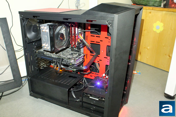 Installing the graphics card, RAM, and fans occurred last in the build, and was fairly straightforward. Due to the ample room provided by the Cooler Master MasterBox 5t, cord management in the back of the case was near flawless. The 35mm gap behind the motherboard tray was more than enough to rearrange the cords to allow for whatever preference the consumer has. This space does have one small drawback when installing other parts of the build. The fans I chose to install, the Thermaltake Riings, needed extra room, and the space that was given to cord management took away from the space I needed to install fans. So, while overall the extra space helped when I was plugging in my motherboard, graphics card, CPU, and hard drive, when I needed to install my fans, I often found my hands cramping and taking longer than it should have in most circumstances to complete the task. The graphics card pictured here is an NVIDIA GeForce GTX 970, which fits this case with plenty of room to spare -- enough to add another drive bay -- but can easily fit graphics cards up to 410mm if the drive bay is removed or moved elsewhere within the case.