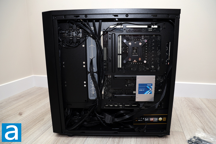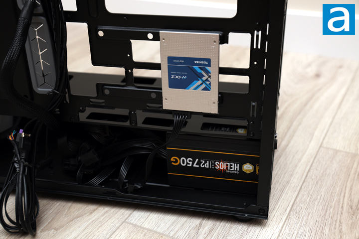 Next, I routed the necessary cables, including the motherboard and CPU ones, to their respective locations. I also directed the front I/O and fan cables to the bottom edge at this point. Finally, I installed the Toshiba OCZ VX500 512GB 2.5" drive. This involved using the four rubber holes and placing them in the correct location. Then, I screwed in the pegs onto the SSD and pushed it into place. This friction hold is generally strong enough to keep the drive securely in place.