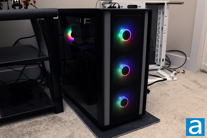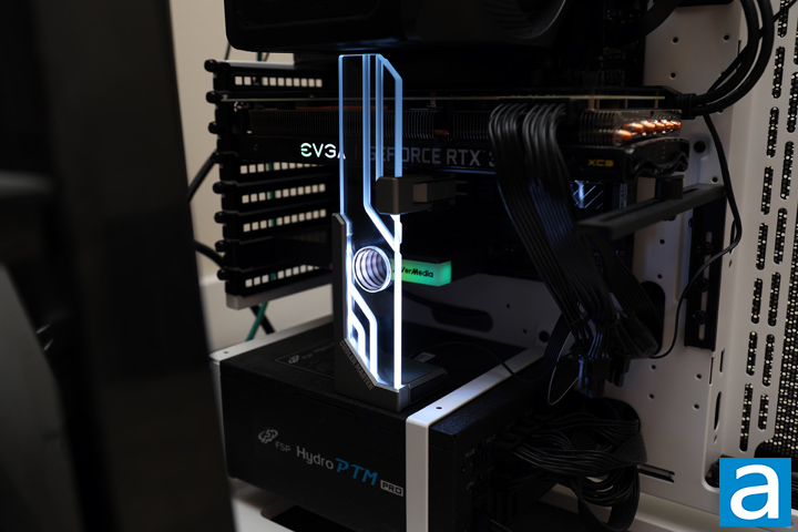 I placed the stand on top of my power supply, set the clamp in place, and secured it down. Afterwards, I plugged the addressable header into the motherboard. Overall, this is quite a stunning piece of hardware. For one, its lights are magnificently bright and shine a lot more. I really like the effect that is created with the glass. Better yet, Cooler Master has not put any branding on the glass, so it does not look like an advertisement for the company. I also appreciate the small "infinity" mirror in the middle for a neat effect.