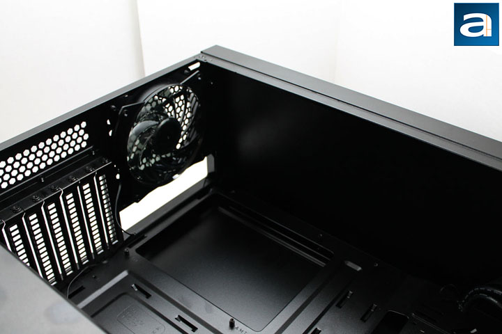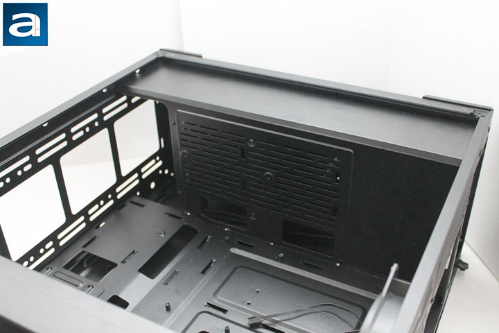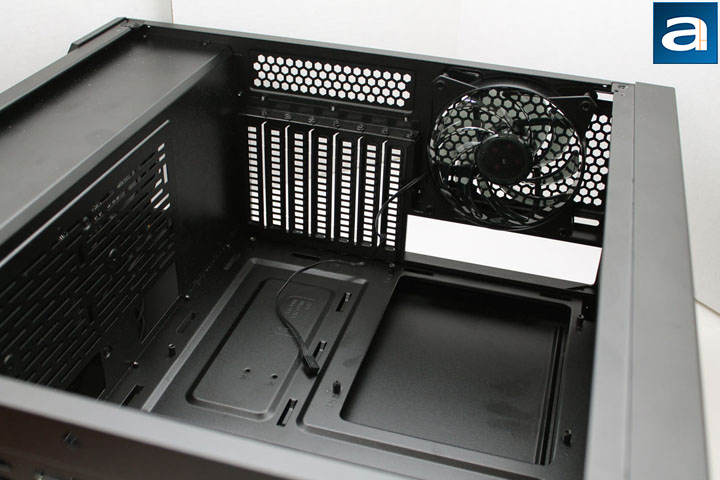 Looking back at the bottom of the chassis, it is hard to see where the power supply fits along with the hard drives in this photo, but the expansion slots are easily accessible and visible. In fact, the power supply and hard drives are installed in the lower chamber for a separate thermal zone. The power supply is screwed into the back, and can have a maximum size of 180mm. The dust filter is found underneath, but it is secured to the case making cleaning more challenging than in previous Cooler Master products.