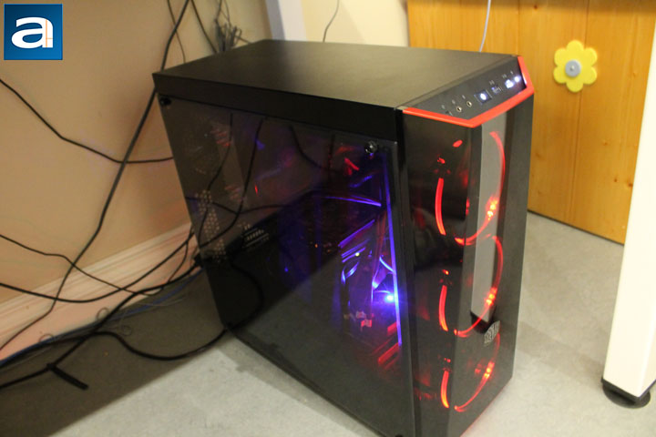 After cleaning up for the day, I brought my newly constructed system down to my room to begin to see how it all turned out. After plugging everything back into the motherboard and video card, then flicking the power switch, the system booted properly as everything came to life. The dark mirrored front panel really makes LED case fans stand out, and brings a heightened sense of pride for the mid-tower. In this case, I have installed three LED fans, which perfectly matched the red accents that came with it. The ability to make the case red, white, or black means accent lighting in the front of the case is easier to modify and play around with to the preferences of the individual consumer.