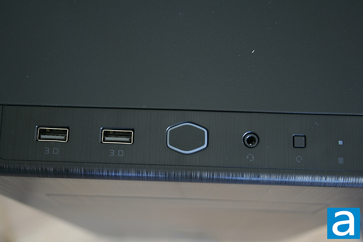 At the top of the case, we can see the I/O panel, which is located at the front edge. Going from left to right, we have two USB 3.2 Type-A ports, hexagon-shaped power button, combined 3.5mm audio jack, reset switch, and an HDD activity light. The lack of a USB Type-C port is disappointing given it is 2021, but not a deal-breaker by any means. The single audio/microphone jack is another nice feature of this product.