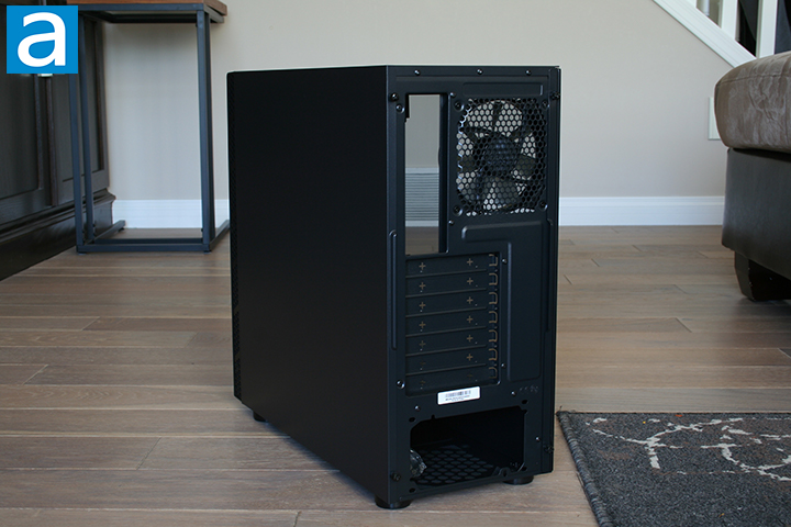 The back of the case is exactly what you would expect from a mid-tower ATX case. A pre-installed 120mm fan is mounted at the top right beside the cut-out for the motherboard I/O shield. Seven horizontal expansion slots can be seen directly below the fan and the motherboard opening. All seven expansion slots can be taken off to make room for GPUs or any expansion cards that may take up an expansion slot on your motherboard. An opening for the power supply can be seen below the horizontal expansion slots. A Cooler Master 120mm fan mounted on the exhaust port is included from the factory, which will be discussed on the next page. Tools are not required to remove the side panels. The four captive thumbscrews keeping the side panels attached to the case can easily be unscrewed and the side panels can be slid off.