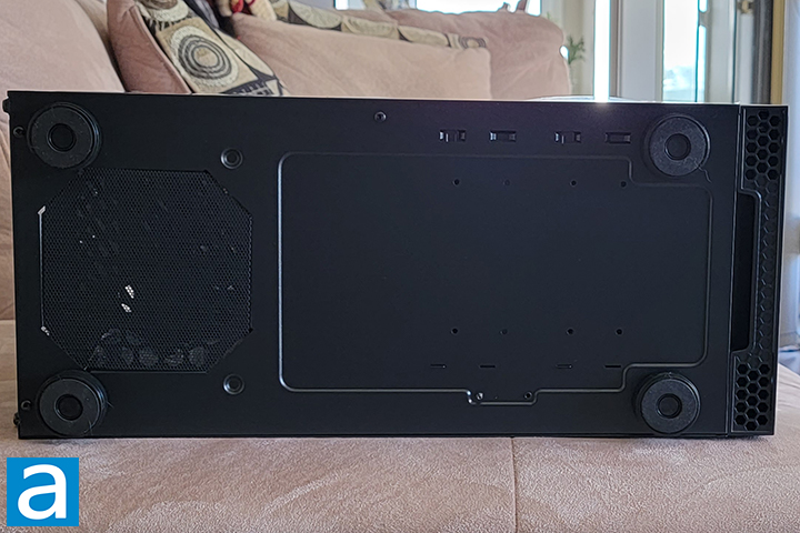 A magnetic removable dust filter can be seen near the back. This dust filter will help maintain clean air intake for your power supply. I am also happy to see the slits are not terribly thick, meaning they will not block a lot of the airflow. The filter is simply a metallic flap that does not come reinforced by any plastic frame, so you will have to use your fingers to slip it off. It also feels a bit cheap since it is frameless. Note the power supply of this case is bottom-mounted, therefore the ventilation area behind the filter is designed for the power supply.