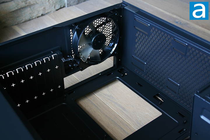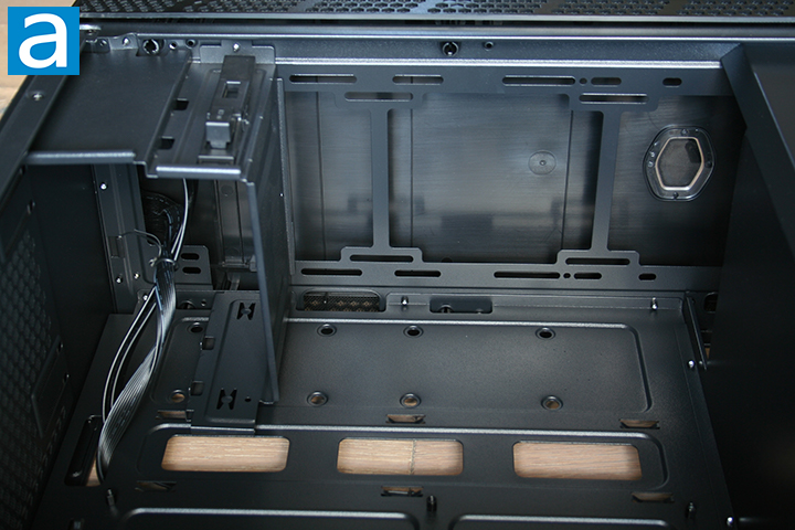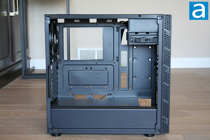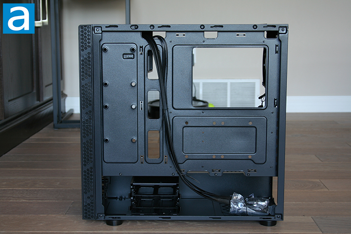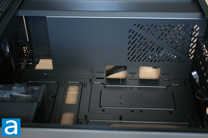 As noted earlier, we can see the PSU shroud is not entirely solid when taking a closer look at the bottom. Two cable routing holes can be seen directly on top of the PSU shroud. These cutouts are smaller than other cutouts we have seen in other cases, but should be large enough to fit most cables through. We can also see more of the pre-installed standoffs on the motherboard fitting area. The ventilation holes come in various sizes throughout the shroud. I think having these ventilation holes is a great design as the PSU will be able to draw in air from the case. No fans can be mounted on the PSU shroud, although this is not a drawback by any means.