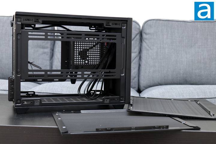 As mundane as it may sound, I really love the design of the Cooler Master MasterBox NR200 when it comes to the side panels. While most side panels are held on with thumbscrews, the MasterBox NR200 uses a pin and clip method. Each side panel has a couple of notched pins that slide into a clip on the steel skeleton. This makes these side panels completely tool-less, which is great to see. In fact, all of the panels can be held together without the need for screws, but Cooler Master has mounted the bottom one with screws since you probably will not need to remove it. I will say the panels are a bit too flexible, which was probably intentional to keep the case lighter, but I would have liked the panels to be a bit thicker for durability. This includes both the sides and the top and bottom.