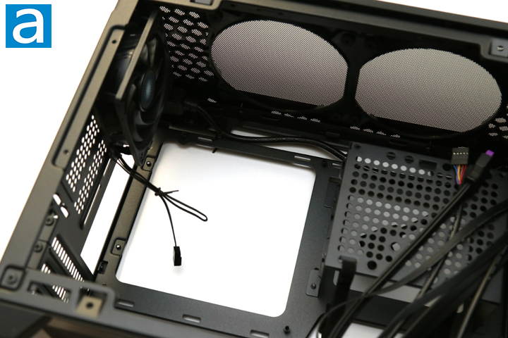 Finally, removing the front panel is as simple as pulling hard enough to release the pins from the clips. At the top, you can see the front connections and the necessary cables to plug in. Underneath, we have several mounting slots for more 2.5" drives to make for a maximum of three drives contained in the Cooler Master MasterBox NR200. Once again, users can also use one of these areas for mounting a pump in a custom liquid loop. Finally, at the bottom, there is a large cut-out. This is meant to let users have a bit more clearance space for longer graphics cards. As video cards are getting bigger, especially with the latest generation from NVIDIA and AMD, it is good to see Cooler Master accommodating for this.