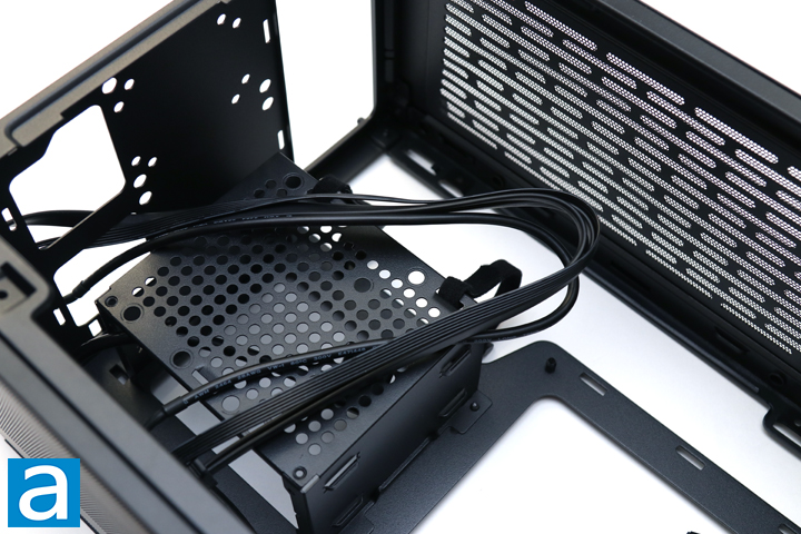 Internally, near the front, you can see the mount for the power supply inside. Inside the Cooler Master MasterBox NR200, users can install an SFX or SFX-L power supply. The power supply bracket can either be mounted as displayed here or on the backside of the front panel. This will depend on your component selection and may be preferable if you want more airflow from the right side panel. This metal enclosure is also fitted with many holes so that users can mount an additional 3.5" hard drive for a maximum of two 3.5" drives internally. There are also mounting points for a 2.5" drive here if you so desire, as well as custom water-cooling pumps and brackets. I do like the different options Cooler Master provides for mounting different components.