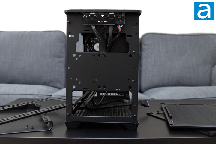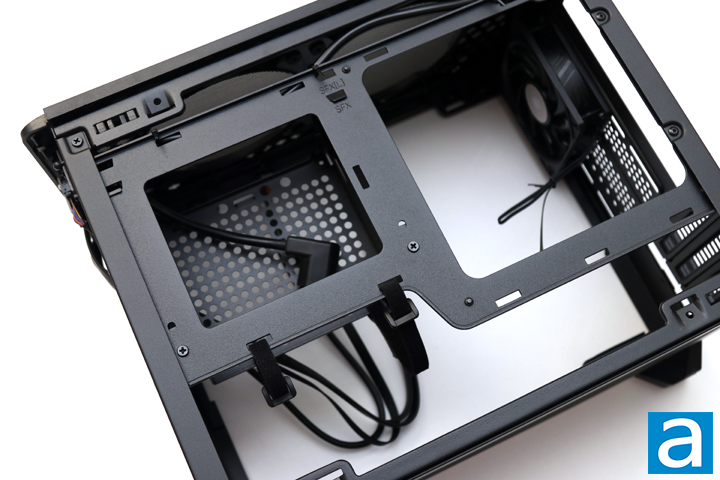 From the back side of the Cooler Master MasterBox NR200, you can get a better picture of the exposed holes for the power supply intake fan and the motherboard. You can also see that the power supply bracket can be mounted higher or lower to position for the longer SFX-L or shorter SFX form factor, respectively. Underneath the bracket, there are two fabric Velcro straps. These are used to gather and manage the excess power cables, which is helpful considering we do not have any cable management at the back of the NR200. This should also keep cables clear of the expansion slot area or where your video card would extend into.