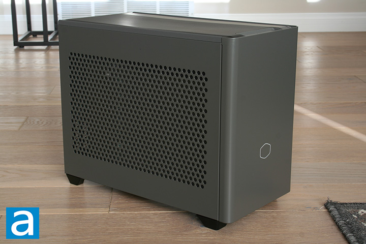 Our review unit of the Cooler Master MasterBox NR200P MAX came in gray, although it is available in a multitude of colors. Every aspect of the case is metal, which feels very solid and is nice to run your finger across. The case takes the shape of a small box, which is not surprising due to its nature of being a mini-ITX chassis. The exterior of the NR200P MAX is identical to the exterior of other cases in the Cooler Master MasterBox NR lineup. The top side contains a full mesh panel. The front panel is also made out of metal, which is nice to see. Overall, I appreciate the simple design of the NR200P MAX.