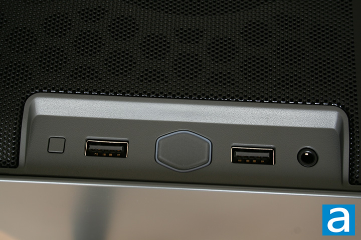 The picture above gives us a better view of the I/O ports. Going left to right, we have a square reset button, USB 3.2 Gen 1 Type-A port, hexagon-shaped power button, another USB 3.2 Gen 1 Type-A port, and a combination audio jack. I wish there was a USB Type-C port here, as it is 2023. The single combined audio jack is another nice feature of this product. For most of us, we have both laptops and desktops, and most modern laptops are commonly equipped with a single 3.5mm jack only. When purchasing a headset, we definitely want something compatible with both laptops and desktops, so it will be inconvenient if we have to deal with the situation where the laptop has a single jack while the desktop has the headphone and microphone jacks split. Some gaming headsets come with separate headphones and microphone plugs though, leading to inconvenience for some. An included Y-split cable would rectify this situation, which the Cooler Master MasterBox NR200P MAX unfortunately did not come with. We can see ventilation holes through the mesh cover at the top. This is for exhausting air through the 280mm liquid cooler at the top, which we will discuss in more detail later.