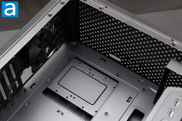 Taking a look at the motherboard area, you can see Cooler Master has already installed the standoff screws for the ATX size. These holes are labeled with different letters to show users where they will possibly need to move the standoffs, in case they do end up installing a smaller motherboard. At the top, you can see there is an area for mounting various cooling options, whether they are radiators or fans. According to Cooler Master, users should be able to mount up to two 120mm or 140mm fans or up to a single 240mm radiator, assuming it does not interfere with your motherboard. However, the top mounting area may inhibit airflow. While this array of circular perforations do not look like it would inhibit airflow, there actually is quite a bit more metal here to block air from getting through. This is the same for all the ventilation and exhaust points around the case, which is a bit unfortunate. I would have much rather seen the standard honeycomb design to allow airflow through this area. On the bottom, we have a square opening to expose the back of the motherboard when it is installed. This means users should be able to mount aftermarket coolers without needing to remove the motherboard from the chassis. The edges around the hole are folded over to prevent fingers or cables from being cut here.
