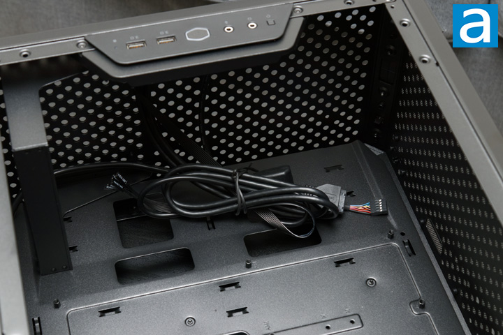 Otherwise, cable routing holes can be found all around this area, letting you route the thicker power supply cables out of the large squares at the front, and around the case as necessary. Neither of these holes are filled with rubber grommets, so you should be careful in how you route cables in. Once again, these holes are folded over to prevent any cutting of cables or fingers. Finally, the front I/O cables can be found here, sleeved in almost all black. This includes a USB 3.0 header, front audio connector, and individual front LED and switch connectors. These cables and the routes they take are affected by the location of the front I/O, so be sure to keep this in mind when cleaning up your cables.