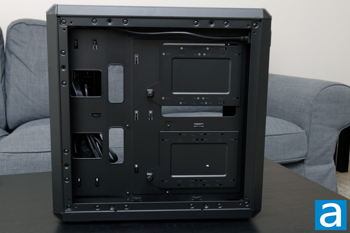 As we have already seen, both side panels come off easily with the removal of their thumbscrews. These two side panels are not the sturdiest, as they exhibit quite a bit of flex. While this is not too surprising for the clear plastic side, I would have liked to see a slightly sturdier steel side. After popping these panels off, you are now greeted by the Cooler Master MasterBox Q500L's seemingly open interior. The rest of the interior is black in color, with no other colors to contrast the already black exterior. This layout seems pretty typical on first glance, with an open area for the motherboard and graphics card or other expansion cards to sit in this area. The power supply also exists in this area, though in a region you may not expect. Due to such a low height for a standard ATX case, we do not have a power supply shroud at the bottom of the case. Speaking of which, while this is a mid-tower ATX case, it can also fit motherboards with the mATX or mITX size.