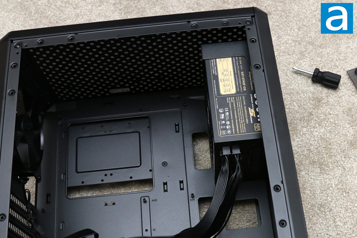 As always, I started with installing the power supply. To do so, I first removed the front I/O module, which meant unscrewing four screws and lifting this trapezoidal unit out. I then removed the power supply bracket from the case, installed the SilverStone Strider Gold S ST85F-GS 850W in place, and remounted the power supply to the front of the case. I should mention, if you are using a modular power supply, you probably want to plug in your necessary cables before remounting the power supply back into the Cooler Master MasterBox Q500L. Mounting the bracket back after a power supply is installed is not the easiest to do, so I would recommend lying the case on the side as I have done in the photo above and letting it rest on its side while you are securing this cage. As we already mentioned, you can install power supplies of up to 180mm in length, though this may affect other components. This power supply is relatively compact, but it takes up about half of the front area already. I tucked the necessary cables through the square routing holes near the front and moved forward.
