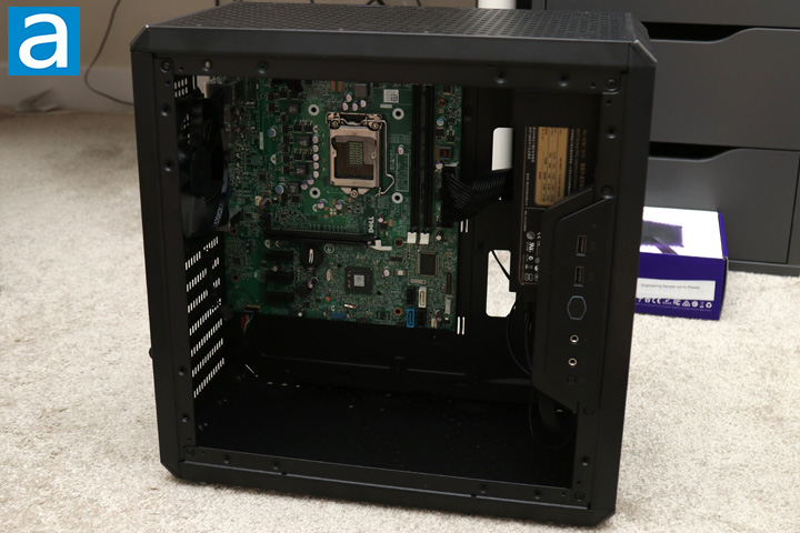 Despite me installing a mATX motherboard here, this actually fills up the chamber of the Cooler Master MasterBox Q500L, leaving only the bottom three expansion slots not filled in. There still is a notable gap between the right side of the motherboard and the rectangular routing holes, but it is not too noticeable. I routed the necessary cables into place, including the CPU and motherboard cables. Next, I remounted the front I/O and plugged in all of the necessary cables into the motherboard. As for compatibility, Cooler Master has provided a maximum height clearance of 160mm for CPU coolers and a maximum length of 360mm for graphics cards. With a power supply longer than 160mm however, the maximum video card length is reduced to 270mm. Since this case only has one fan, I would probably suggest installing a second or third fan at the bottom for some more intake. Overall, I found the internal layout to be good with necessary routing holes at the sides and bottom to route all the necessary cables.
