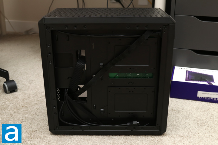 On the back side, you can mount your necessary storage options, while routing the power and SATA cables through the side routing holes. I did not generally use the zip tie points but I still think there is an ample amount for users who may find it more useful. Unfortunately, the power supply I used had a slightly shorter CPU power cable, so the diagonal path across the back was the only way I could leave the cable with enough length. Thankfully, the more than sufficient spacing at the back meant even the thicker motherboard power cable had no issues being routed through the back. Putting the right side cover back onto the Cooler Master MasterBox Q500L was also done with ease since I did not have to force any cables down. Overall, building in the Cooler Master MasterBox Q500L was a good experience, but the metal flexing was a bit concerning during installation, as I noticed items like the power supply holder bending under pressure.