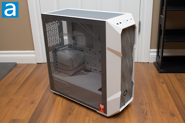 Starting from the front, we have a mostly mesh implementation that allows more airflow while doubling as a pseudo-dust filter. Cooler Master calls this a dust filter, but I would think of it as a mere mesh front panel. We see the diamond pattern on the mesh once again, adding more dimension to what is usually just a flat panel. Cooler Master has their simplified logo closer to the bottom half of the mesh, aligning well with the center of the bottom fan. This small attention to detail means so much, especially as you realize the logo does not hide any of the case fans' RGB LED lighting. The left side uses tempered glass to display the components within your system. The glass has a very clean appearance with gray borders. As I have noted in my MasterBox TD300 Mesh review, the tempered glass panel has a crystalline design to help transition between the front and side panel. This simply helps make the design feel complete. The panel is easy to remove with a single thumbscrew at the back to let it loose before pulling it up off the bottom and its clips. The right side panel is quite generic, being made entirely out of metal and used to cover up cables. There are no holes used for ventilation on this side. This panel is a little more generic in removal, having two screws on the back to allow it to slide off.