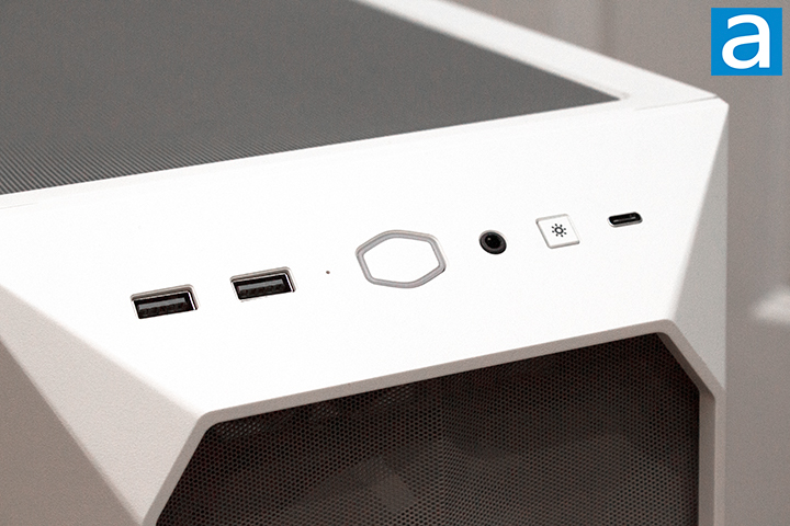 The I/O can be found on the front panel near the top of the case. From left to right, we have the two USB 3.2 Type-A ports and a white LED for storage drive activity. Following up these ports, we have the power button. As usual, the power button is shaped just like the Cooler Master logo and the perimeter illuminates white when turned on. Next, we have the audio jack. After that, we have the ARGB Fan Hub button. Finally, we have the USB 3.2 Type-C port. The follows a similar order to the previous model, but with slightly more updated ports. Having the audio jack on the right side may make headphone and mic cables tauter, given the slight additional distance required to travel, assuming your PC is placed on the right side, but this is a bit of a moot point, given it being a very slight reach. The top of the case has a nice magnetic dust filter, likewise to many of the cases we have been seeing in the past while.