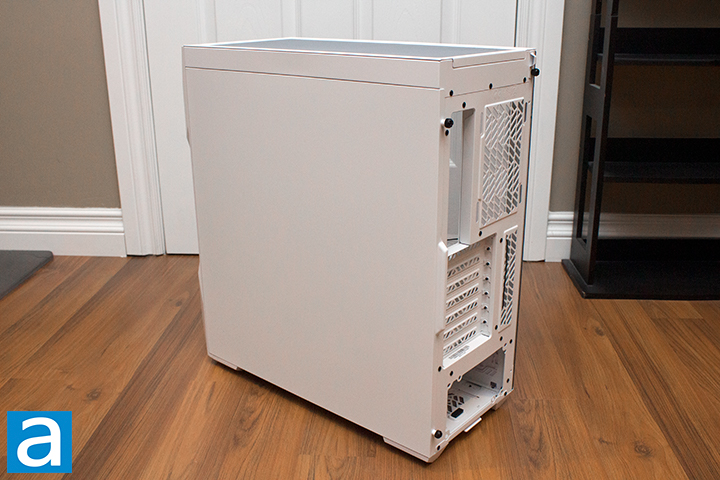 The back of the Cooler Master MasterBox TD500 Mesh V2 is standard to any mid-tower case. At the top, we have the motherboard backplate cutout alongside a 120mm fan mount. Underneath, we have seven removable expansion slots. The expansion slots can be simply screwed off. Something nice I found with this area is the slight indent into the case for the motherboard and expansion slots. Although it might not seem like much, it makes the installation process slightly easier. This case does not have support for vertical GPU mounting. The right side panel is white in color and helps hide the cables perfectly. This panel is quite plain, but you will likely not look at it. It is held on with captive thumbscrews.